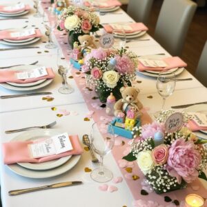 Add tiny baby girl items like soft booties, bows, and rattles to the table setup.