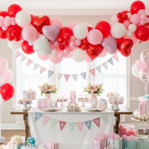 A simple balloon garland in red, white, and pink instantly lifts the room.
