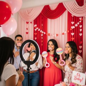 Create a small corner with a red or pink backdrop, a few props like heart glasses or baby rattles, and let guests take fun pictures.