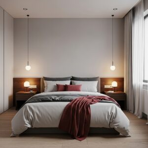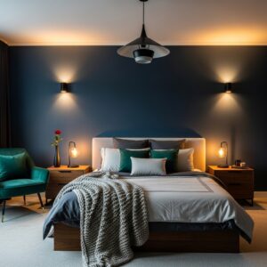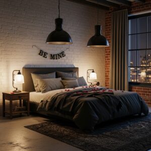 A modern floor lamp, bedside sconces, or industrial-style pendant lights can create a romantic glow.