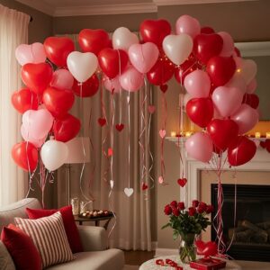 Make a fun DIY balloon display using heart-shaped balloons in red, pink, and white.