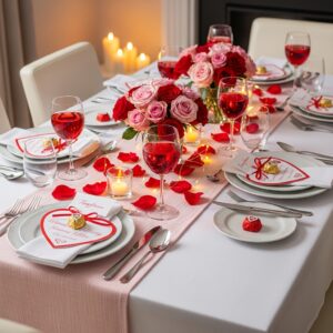 Sprinkle heart-shaped confetti, rose petals, or tiny decorative stones across the table for a festive touch.
