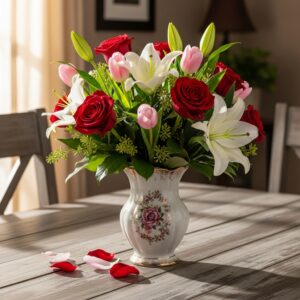 A classic bouquet of red roses is always a hit, but you can also mix pink tulips, white lilies, or carnations for a softer look.