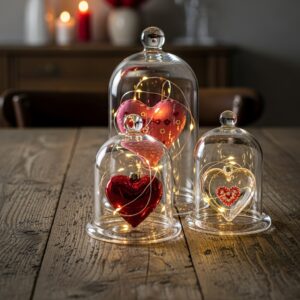 Glass cloches are a chic way to display small Valentine’s accents like tiny heart ornaments, fairy lights, or chocolate truffles.