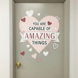 Decorating the door with a meaningful quote about love, friendship, or kindness is a simple yet powerful idea.