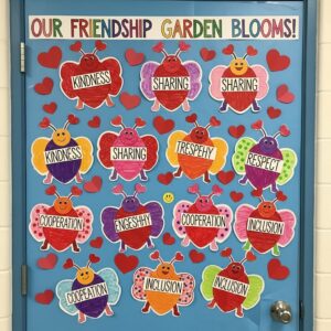 A friendship-themed love bug door focuses on kindness and classroom values.
