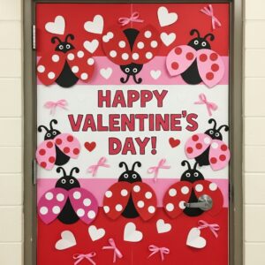 A ladybug-themed Valentine’s door is a classic and cheerful choice for any classroom.