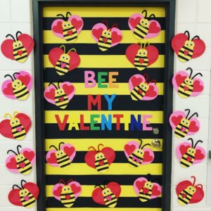 The phrase “Bee My Valentine” can be placed at the top, while small bees with student names decorate the rest of the door.