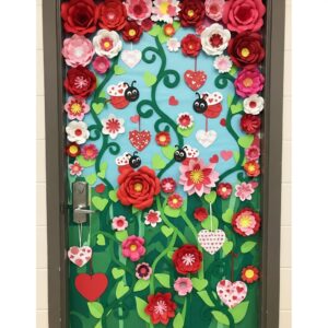 This design adds depth and texture to the door while promoting a positive Valentine’s Day message.