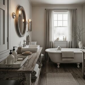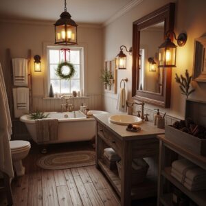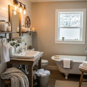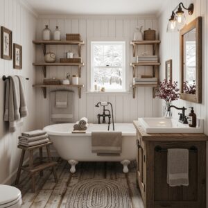 These small details add farmhouse character and make the bathroom feel warm and lived-in during winter.