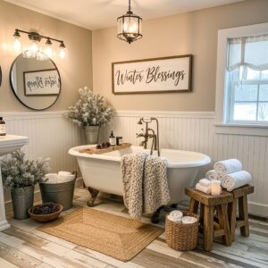 Winter farmhouse bathroom decor is all about warmth, simplicity, and comfort.