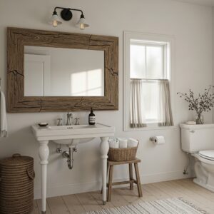 A mirror with a rustic wood frame adds instant farmhouse charm.