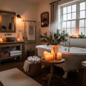 Candles or reed diffusers help create a relaxing and inviting seasonal atmosphere.