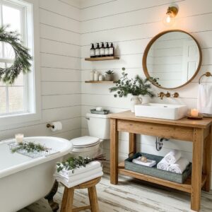 Natural wood is a farmhouse essential. Add wooden shelves, stools, or trays to bring warmth into your winter bathroom.