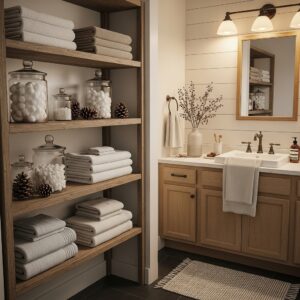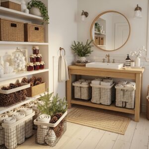 Style them with folded towels, glass jars, and small winter decor pieces to keep the space practical yet decorative.