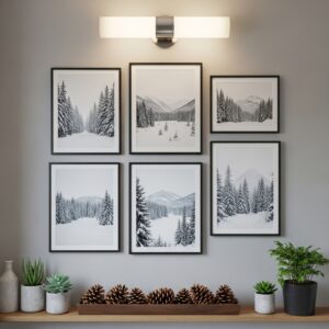 Decorate with winter-themed prints, framed photos of snowy landscapes, or cozy indoor scenes.