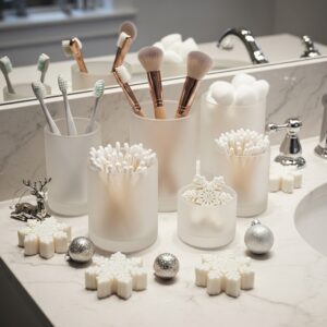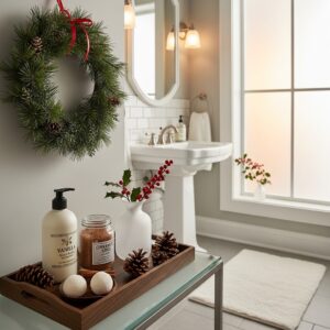 Add subtle winter accents like a mini pine wreath, a small faux snow display, or a tray with seasonal bath products.