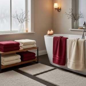Swap thin towels and mats for thick, fluffy versions in warm tones like burgundy, deep green, or soft cream.