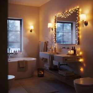 Consider adding string lights or LED candles around mirrors or shelves to create a cozy, intimate glow.