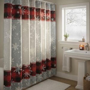 Choose shower curtains in rich textures or winter patterns like snowflakes, plaid, or forest scenes.