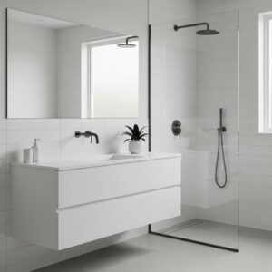 Opt for metallic finishes like matte black, brushed nickel, or chrome for faucets, showerheads, and cabinet hardware.
