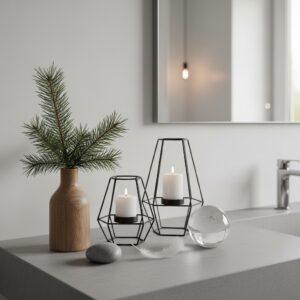 Add subtle winter accessories like small pine vases, geometric candle holders, or frosted glass decor.
