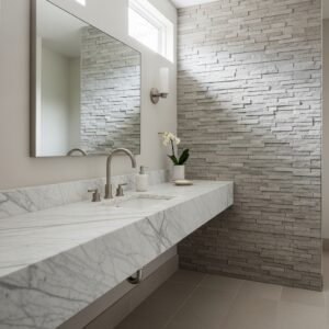 Use marble or stone countertops, tiles, or accent walls in neutral tones.
