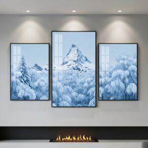 Choose artwork that blends blue hues with winter themes—icy forests, abstract snowfalls, watercolor mountains, or blue modern prints.