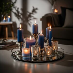 To add depth, include a mirrored tray underneath so the candlelight reflects beautifully around the room.