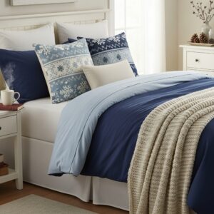 Choose bedding with winter motifs like subtle snowflakes, plaid, or geometric winter patterns for a more festive feel.