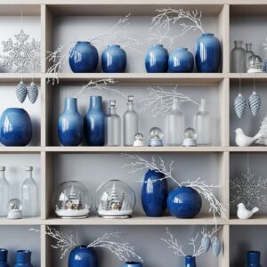 Arrange them in groups of three for balance. Incorporate some white elements like faux snow or white ceramic pieces so the blue pops without overwhelming the shelf.