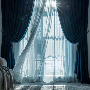 Deep navy velvet curtains make a room look sophisticated and warm, while lighter icy-blue sheers brighten the space.