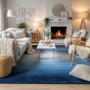 Choose a blue rug with subtle patterns like icy lines, Scandinavian motifs, or soft gradient blues.