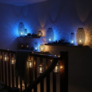 Wrap them around stair railings, window frames, or shelves. For a cozier vibe, place blue LED lanterns near your entryway or fireplace.