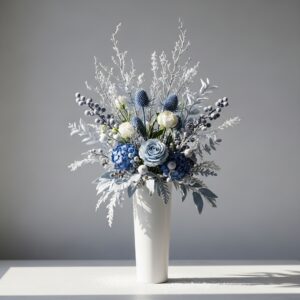 Think eucalyptus, winter berries, snow-tipped branches, or blue hydrangeas.