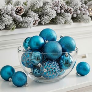 Place navy or sky-blue ornaments in clear glass bowls, scatter them on mantles, or hang them on indoor plants.