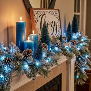 Your mantle can shine with winter blues by adding blue candles, small blue trees, snowy garlands, and frosted pinecones.