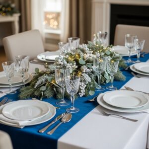 Dress your dining table with a blue runner made of velvet, linen, or cotton.