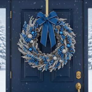 A blue-themed wreath instantly welcomes guests with a winter aesthetic.