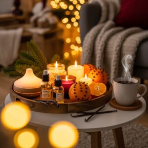 Scent is a powerful part of winter decor. Use essential oil diffusers, scented candles, or simmer pots with oranges, cloves, eucalyptus, and vanilla.