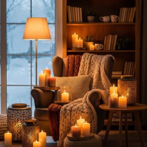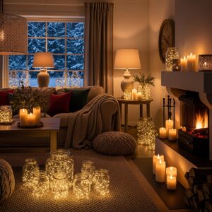 Add soft-glow lamps, fairy lights in jars, LED candles, and even rope lights under shelves for a warm, inviting glow that transforms your home into a cozy winter escape.