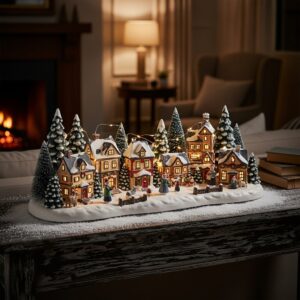 Use small ceramic houses, snow-dusted trees, and fairy lights to create a magical winter village on shelves, coffee tables, or console tables.