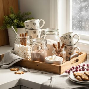 Use a tray or small shelf with mugs, cocoa jars, marshmallows, cinnamon sticks, and festive spoons.