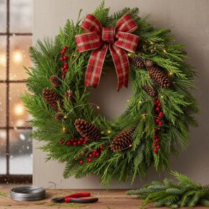 Attach greenery, pinecones, berries, or ornaments with floral wire.