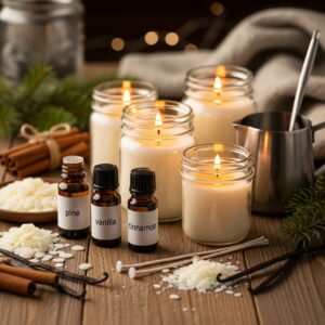 Melt soy wax and add essential oils such as pine, cinnamon, or vanilla.