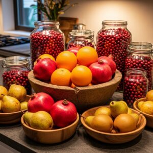 Winter fruits like oranges, pomegranates, pears, and cranberries make great natural decor.