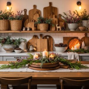 Winter decor loves natural warmth. Add wooden cutting boards, wooden bowls, woven baskets, or rustic crates.