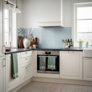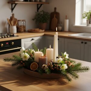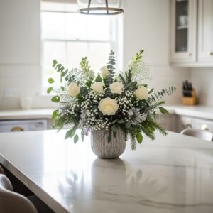 White roses, baby’s breath, eucalyptus, or dried florals bring a fresh winter touch that keeps your kitchen feeling bright and elegant.