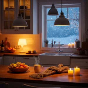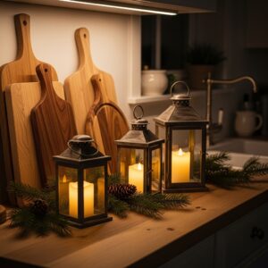 The soft, flickering glow creates a peaceful winter ambiance while keeping things safe for the kitchen environment.