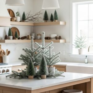 Place them on your island, in corners, or on floating shelves. Choose trees with a snowy, frosted, or natural look depending on your kitchen style.
